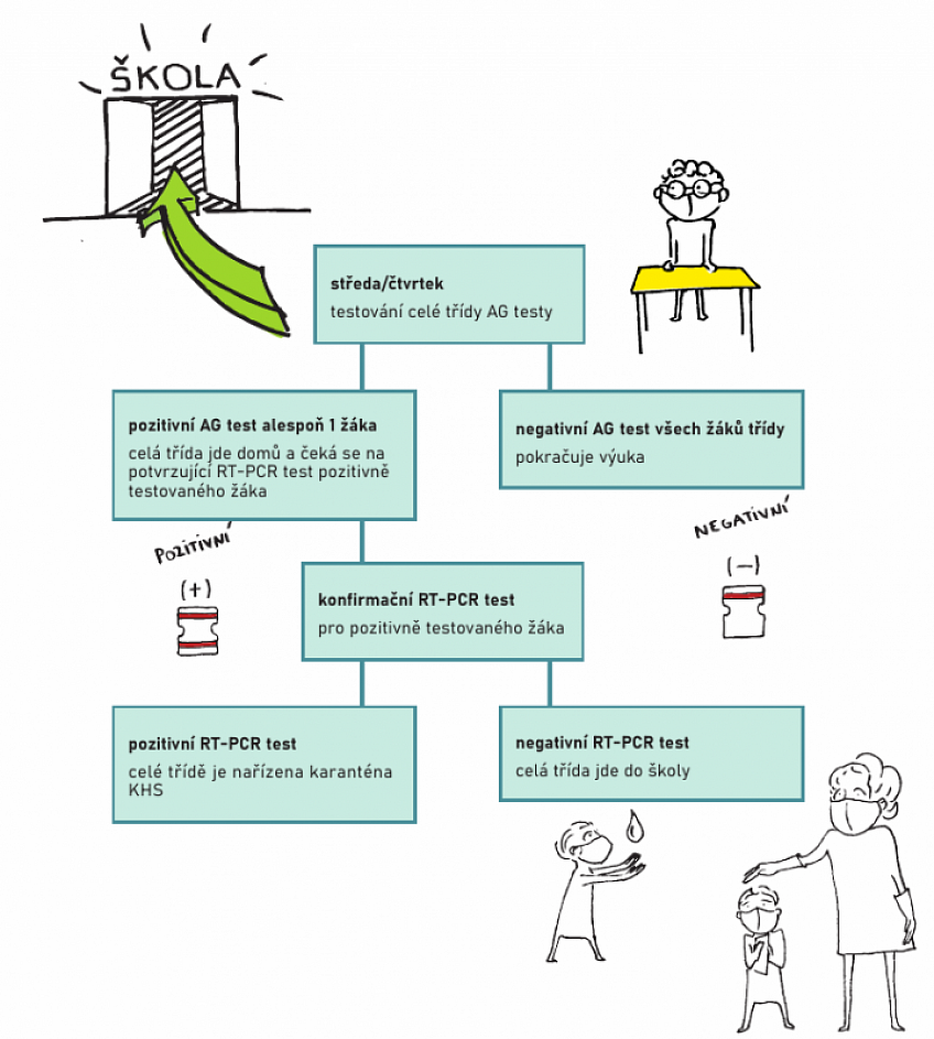 Testování ve čtvrtek bude probíhat stejným způsobem jako v pondělí. Při čtvrtečním testování je zásadní rozdíl. V případě, že by měl žák pozitivní test ve čtvrtek, odchází domů všichni žáci třídy. Pozitivně testovaný žák pak bude muset absolvovat PCR test. Negativní výsledek tohoto testu znamená, že nikdo nezůstává v karanténě. V případě pozitivního PCR testu budou muset absolvovat PCR test všichni žáci třídy a dokud nebudou známy výsledky, budou v karanténě.