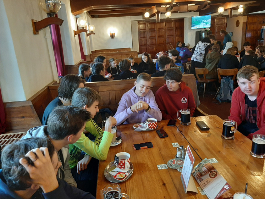 Zdravíme z Krkonoš! Jsme po náročném výstupu, kdy hory prověřily sílu soudržnosti naší třídy, někdo někomu nesl batoh, někdo dokonce živý náklad, nebojte, nakonec všichni přežili.