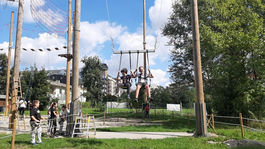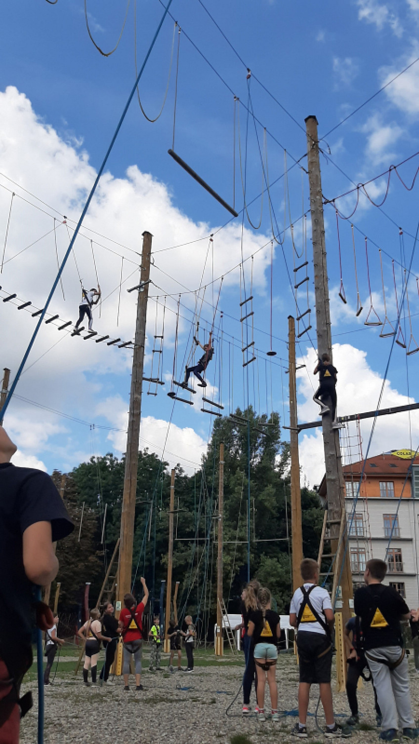 Ve čtvrtek 2.září jsme si parádně užili 6-hodinový program v lanovém parku ve Vysočanech. Učili jsme se zde vzájemnému respektu, důvěře a toleranci, a zároveň si užili krásný letní den při nevšedních aktivitách a navíc už všichni umíme horolezecké jištění a slaňování.