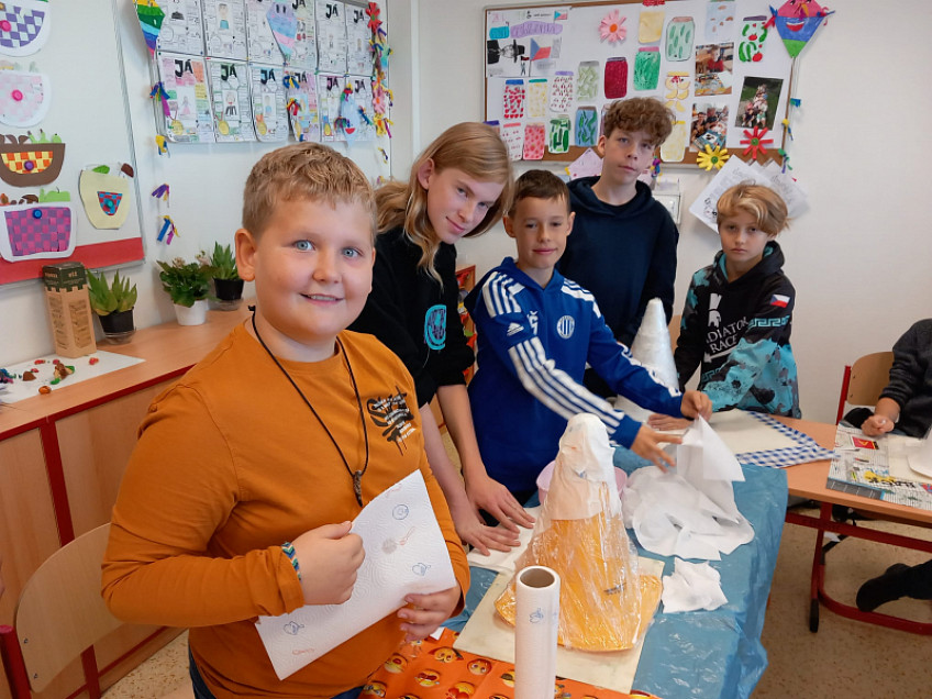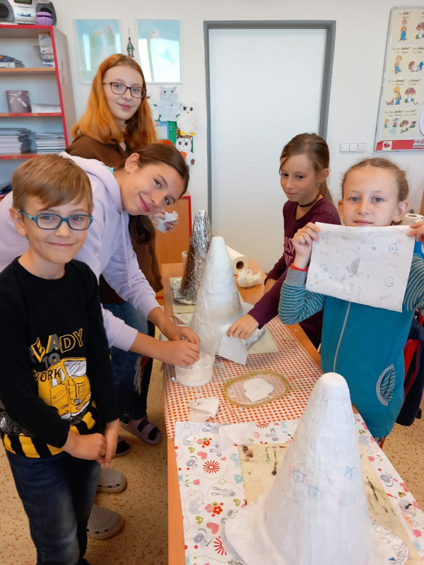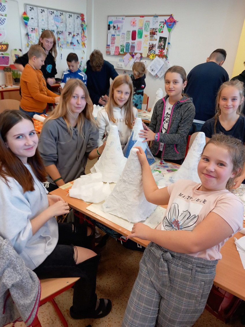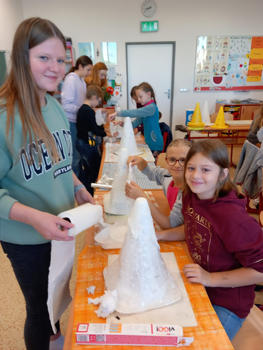 Děti se na žákovské samosprávě domluvily na mezitřídních projektech. Tvorba kouzelnických klobouků v podání osmáků a čtvrťáků zde.