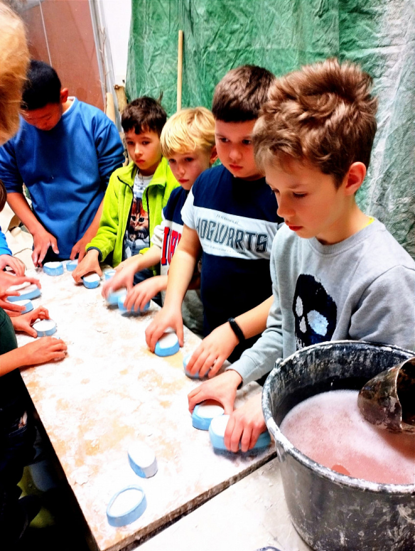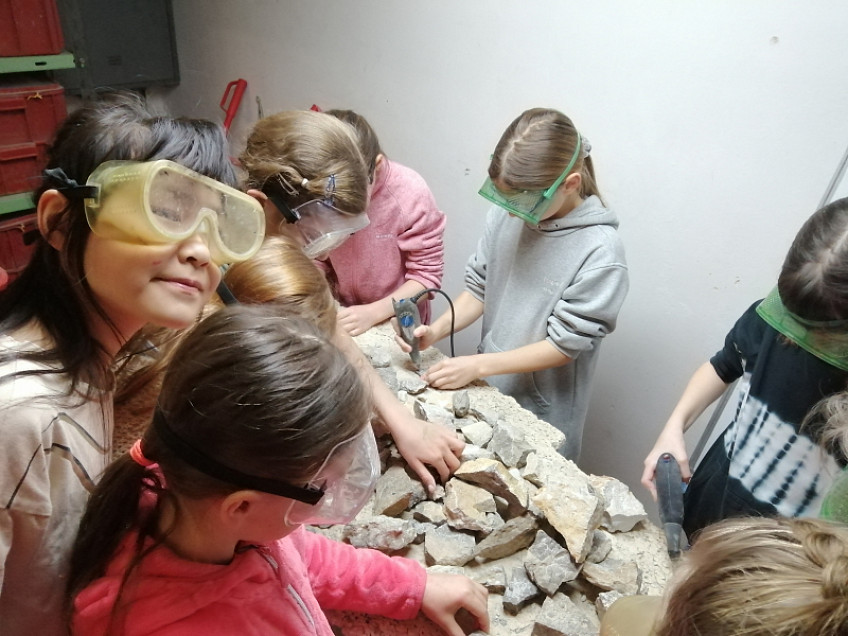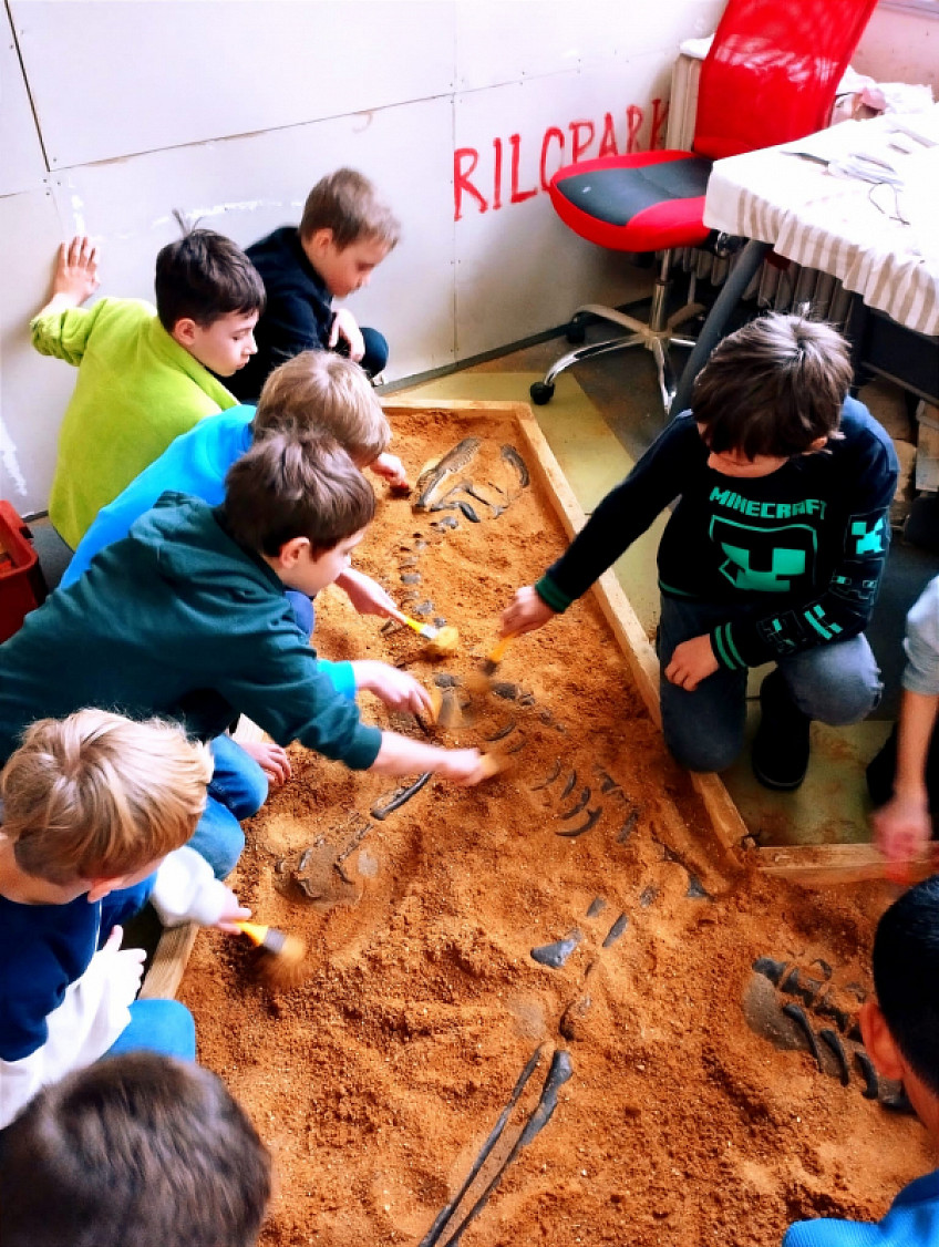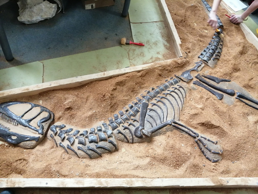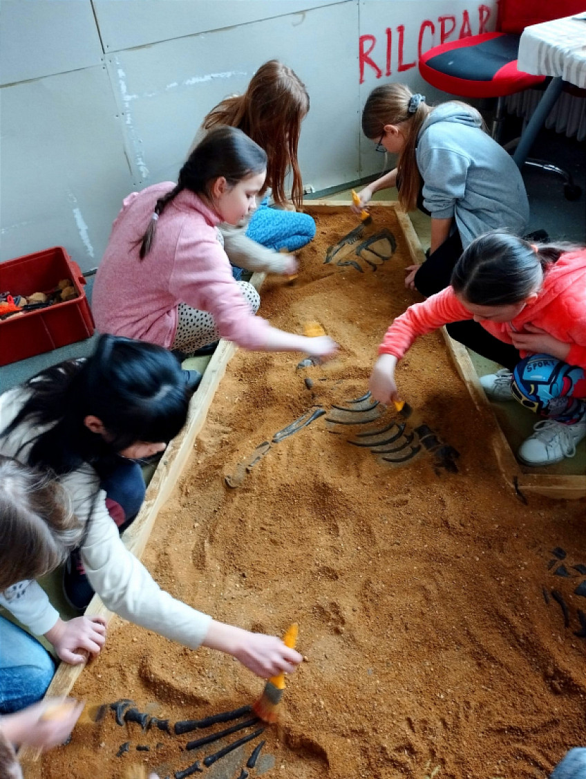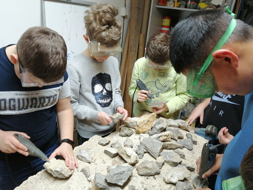 Nejdříve jsme zhlédli zajímavou prezentaci o pravěkém moři, zblízka si prohlédli a potěžkali skutečnou zkamenělinu trilobitů, potom jsme odkrývali štětečkem kostru dinosaura ukrytého v písku, odlévali sádrové odlitky a pomocí vibrační jehly jsme odstraňovali nánosy ze skutečných zkamenělin. Tato exkurze byla opravdu hodně zajímavá a zábavná.