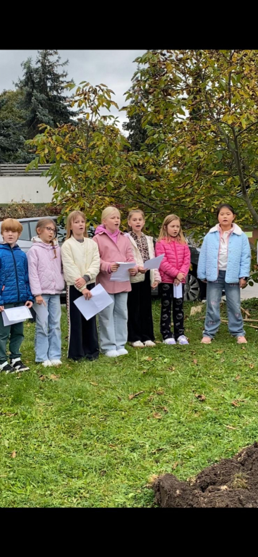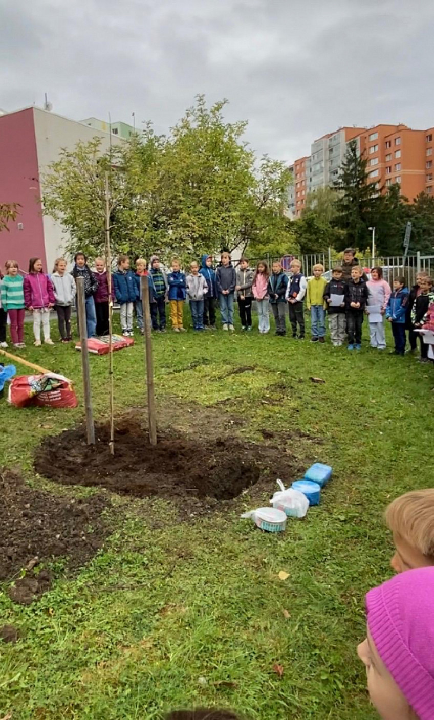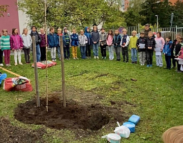 V pátek 9.10. se třetí třídy zúčastnily slavnostního sázení stromu - javoru, které probíhalo pod mottem "Jak porostu se svým stromem?". Javor byl zasazen za nádherného zpěvu dětí, které zaspívaly píseň od Jaroslava Uhlíře a Zdeňka Svěráka ,,Stromy". Ke kořenům také děti symbolicky ukryly své slohové práce, ve kterých se papíru svěřily, kde se vidí do budoucna - jaké by chtěly mít zájmy, jaké by chtěly mít povolání a jakým člověkem by se chtěly stát. Ke svému pokladu se znovu vrátí v 9. třídě, kdy své práce vykopou. Na instagramu školy si můžete poslechnout ukázku.