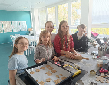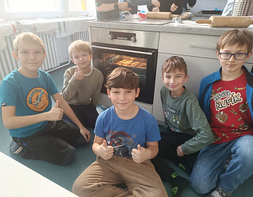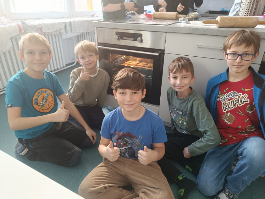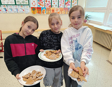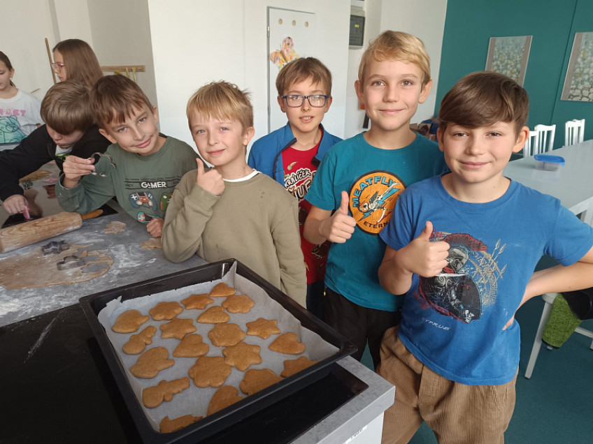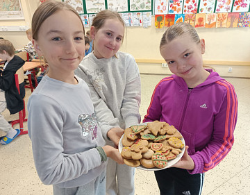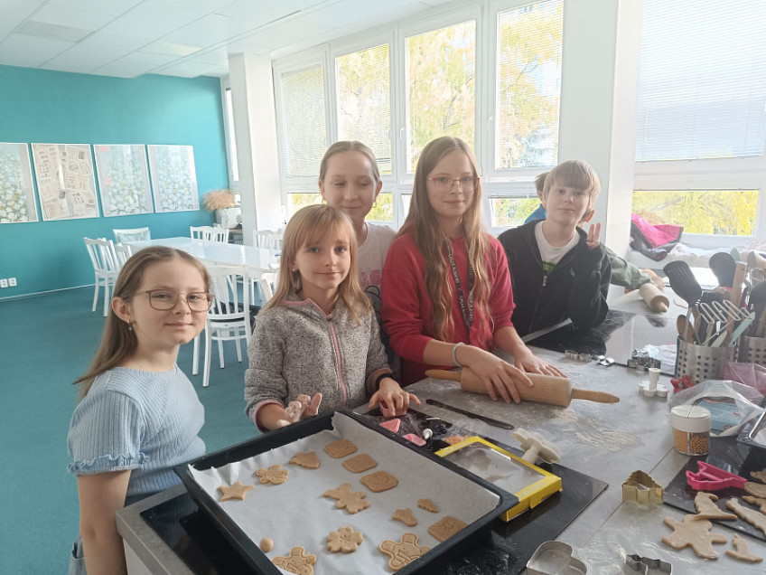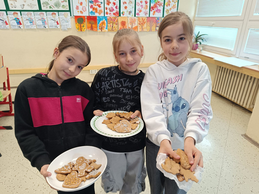 Žáci 4.D si v rámci pracovních činností vyzkoušeli pečení perníčků ve školní kuchyni. Děti si užily společnou práci a naladily se na blížící se Vánoce.“
