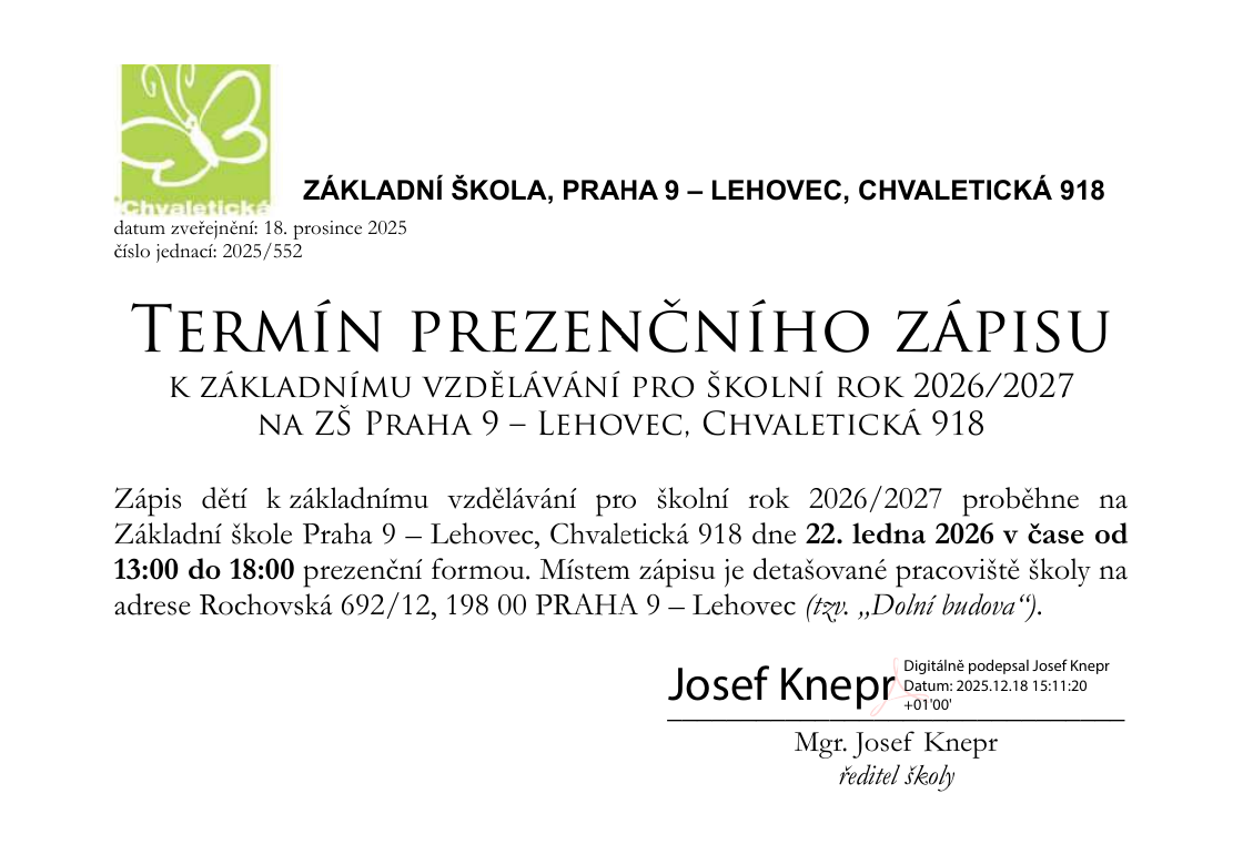 TERMÍN ZÁPISU A KRITÉRIA K ZÁPISU pro školní rok 2026/2027