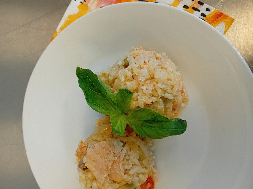 Rizoto s lososem, cherry rajčaty a hráškem, čerstvá bazalka a parmezán