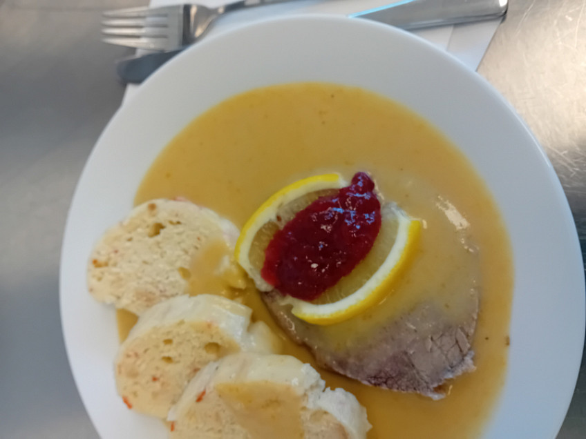 Svíčková na smetaně, houskový knedlík se špaldovou moukou a mrkví, citrón, brusinky